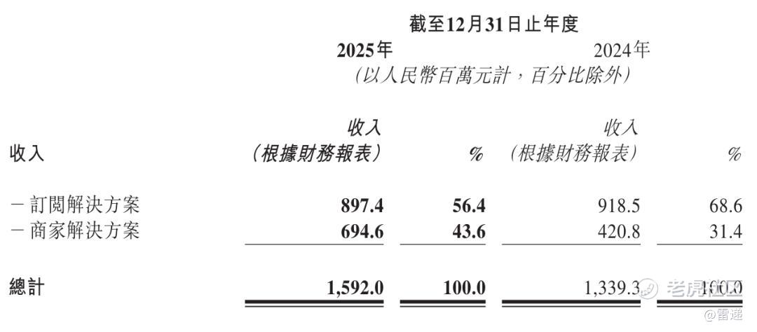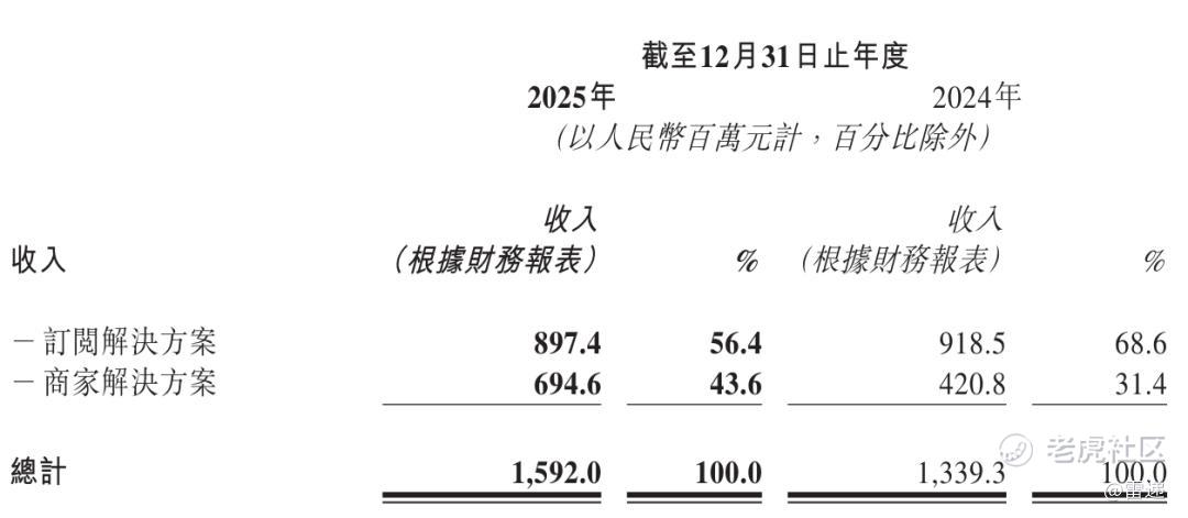微盟集团2025年来自订阅解决方案收入为9亿元,占比为56.4%;来自商家解决方案收入为6.95亿元,占比为43.6%。