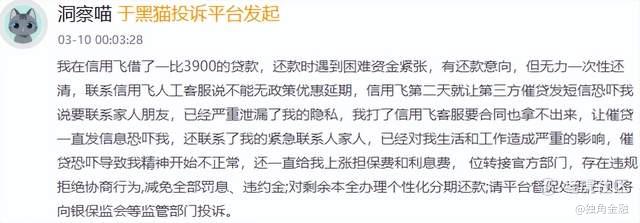 根据消费者投诉信息,信用飞催收存在短信、电话恐吓,泄露隐私、联系家人与朋友,甚至骚扰工作单位、联系领导与同事等行为,严重影响了消费者的生活与工作,很多消费者还因此出现精神问题。