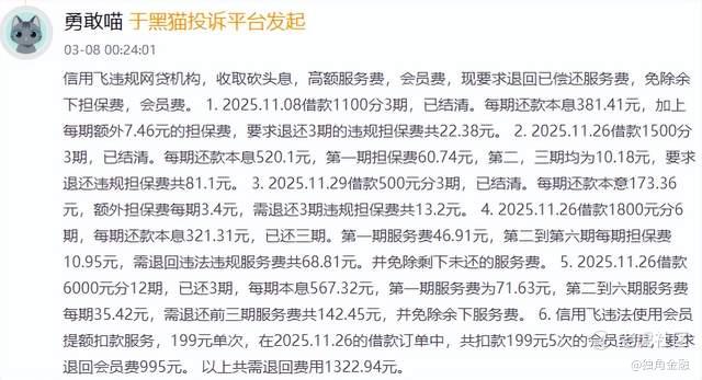 在“黑猫投诉”平台,有关信用飞“高利贷”“砍头息”的投诉居高不下。