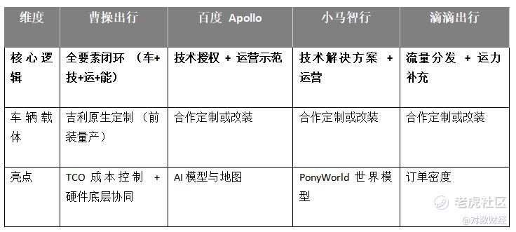 百度的逻辑是“技术授权+运营示范”,小马智行是“技术解决方案+运营”,滴滴是“流量分发+运力补充”。而曹操出行,走的是“全要素闭环”——车+技+运+能,全部自己干。也是唯一一个“TCO(总持有成本)控制和硬件底层协同”的玩家。