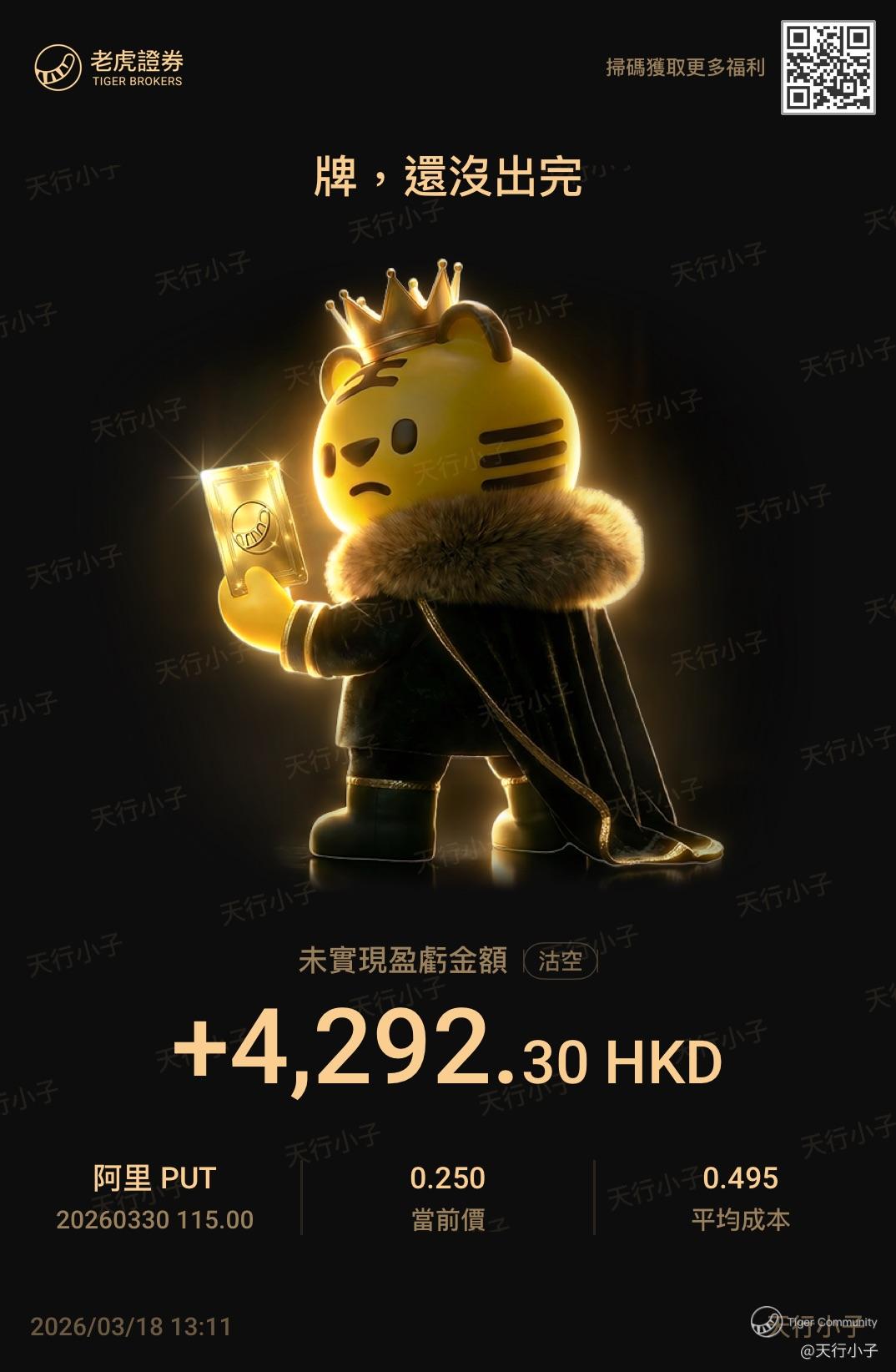 $ALB.HK 20260330 115.00 PUT$ sell put $阿里巴巴-W(09988)$ 就系有呢个唔好处,去到一定程度,就算大升,就已经行人止步。回想月头的时候,我开$115已经好保守,市况转差得太快,本来都唔算开好多杠杆,但系因为短时间大幅下跌,帐面上出现咗大量亏蚀,一个星期前大家仲考虑是否需要去到$95支持位,留下的真系需要信念。但系由于流动性开始紧张,就算有信念都要采取防守嘅状态,否则高位加仓,可以以万计,亏损50,000以上去到获取盈利,真系一念天堂一念地狱。所以唔好一口气开咁多,否则赚唔到最大嘅肉[开心] 。不过总算执返身彩,我一路相信佢唔会跌穿$120[笑哭] [笑哭] 。原本我想嘅剧本,系开两个星期之后就转近仓。相信各位朋友都同我一样回血。[爱你]