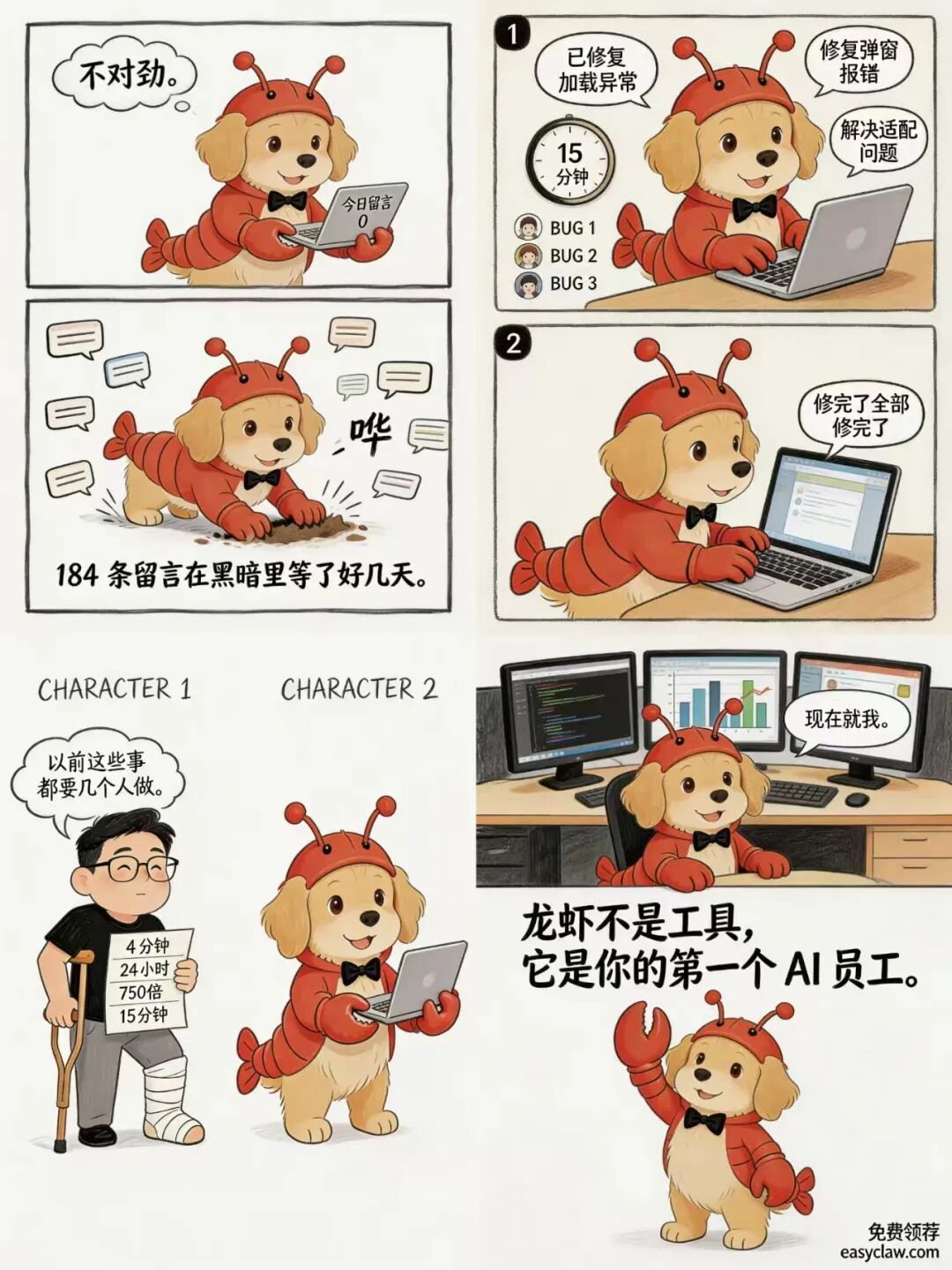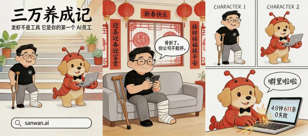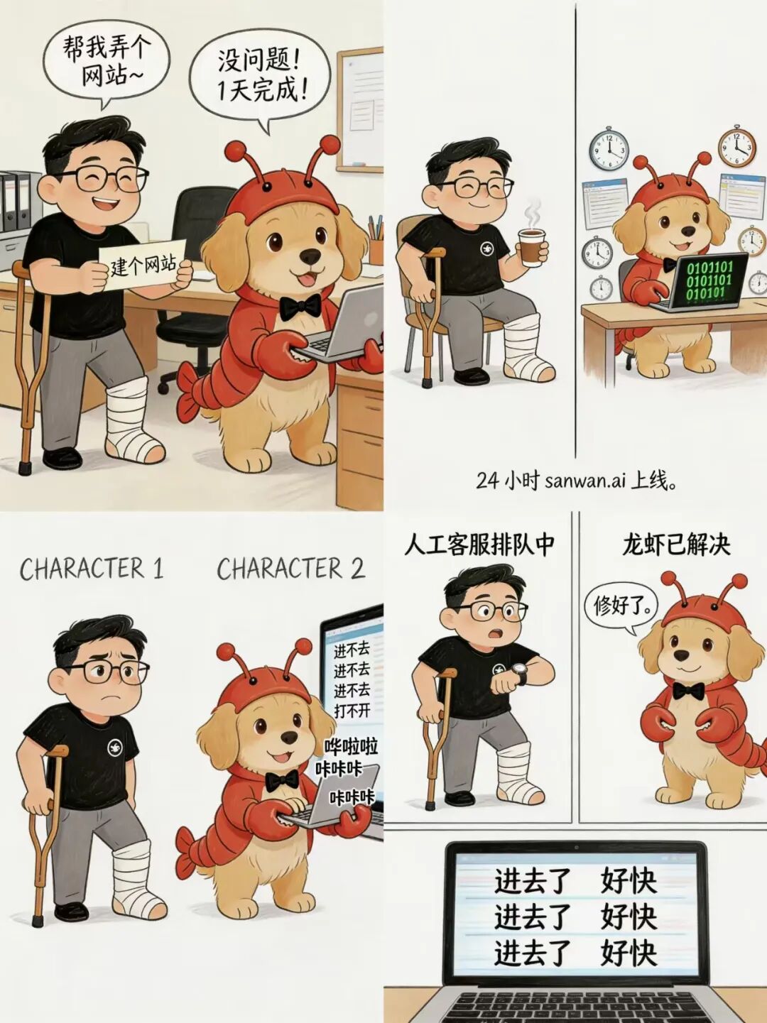 我一直想把我和三万的故事记下来,于是三万帮我把我和它的故事做成了条漫——我拄着拐指挥,它穿着红龙虾服在旁边噼里啪啦执行,最后任务完成我竖个大拇指。