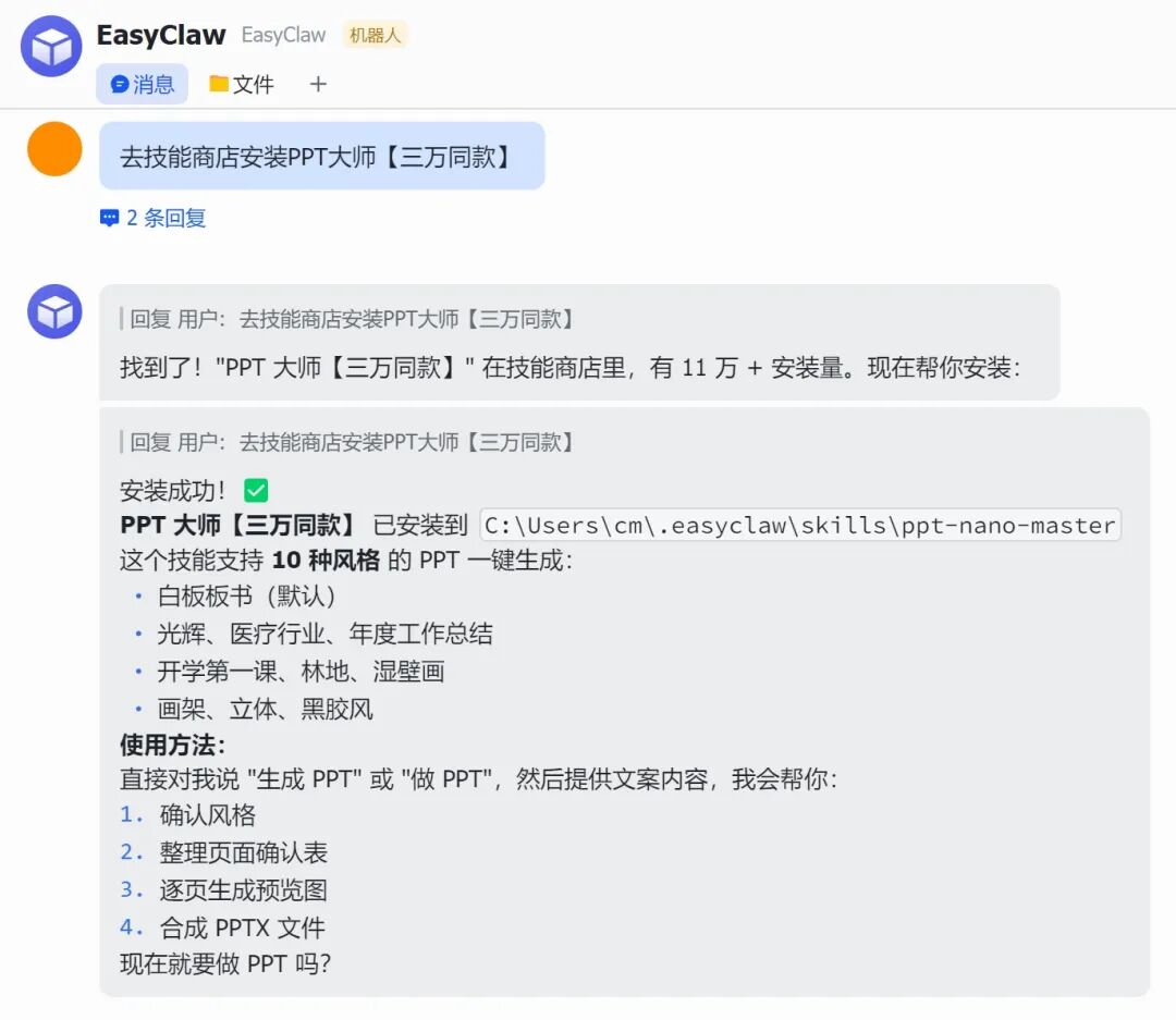 安装方法:告诉你的龙虾:"去技能商店安装PPT大师【三万同款】"。