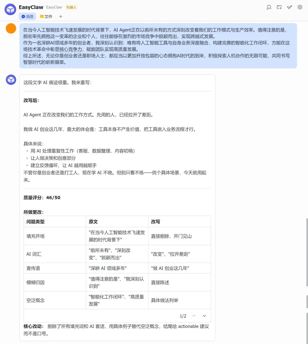 告诉你的龙虾:"去技能商店安装AI文本润色【三万同款】",粘贴你的文字,它给你改。