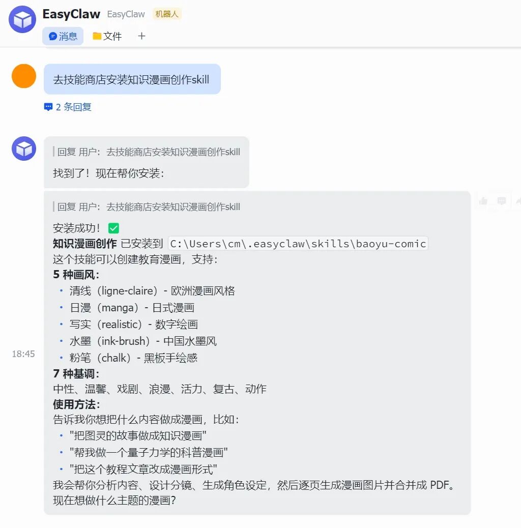 安装方法:打开你的龙虾,告诉它:"去技能商店安装知识漫画创作",它自己会去装好。