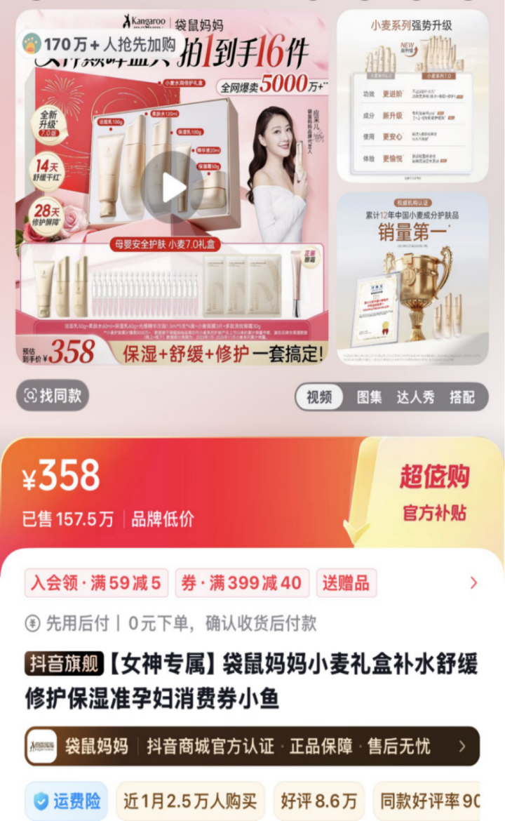 “当时就是冲着‘孕妇专用’才买的,觉得肯定比普通护肤品安全,没想到会这样。”南京怀孕两个多月的邓先生妻子,在袋鼠妈妈婴童用品旗舰店抖音直播间,看到“安不安全看成分”“1000位妈妈做了产品测试没有任何不良事件”的宣传后,购买了准孕期全套精细养护系列、准孕妇小麦舒敏修护系列礼盒。