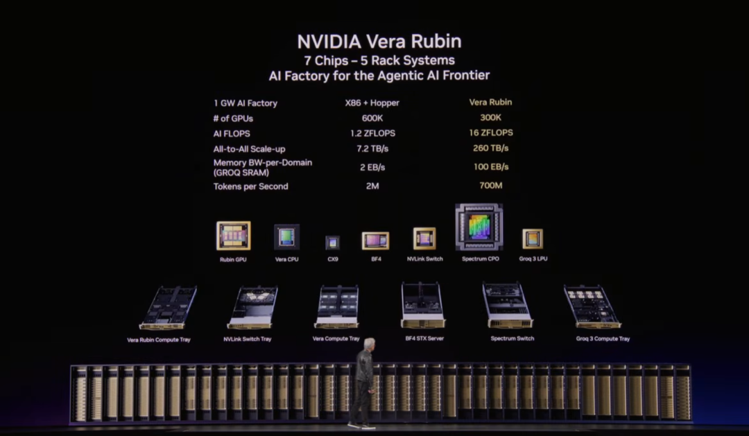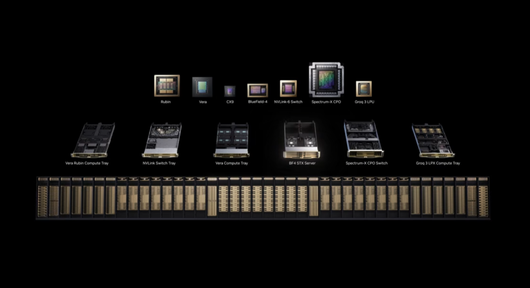 这套革命性平台由七颗全新芯片、五种机架组成一台完整 AI 超算:Rubin GPU、Vera CPU、NVLink 6 交换机、ConnectX-9 SuperNIC、BlueField-4 DPU、Spectrum-6 以太网交换机、Groq 3 LPU。