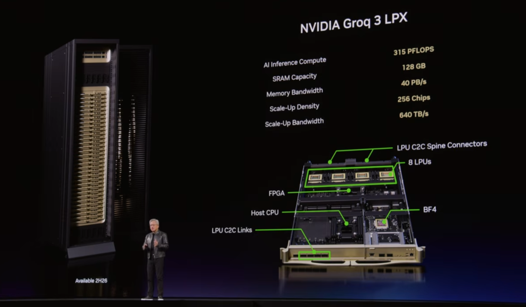 Groq 3 LPU 由三星代工,已量产,2026 年 Q3 出货;单 LPX 机架 256 颗 LPU,扩展带宽 640 TB/s。