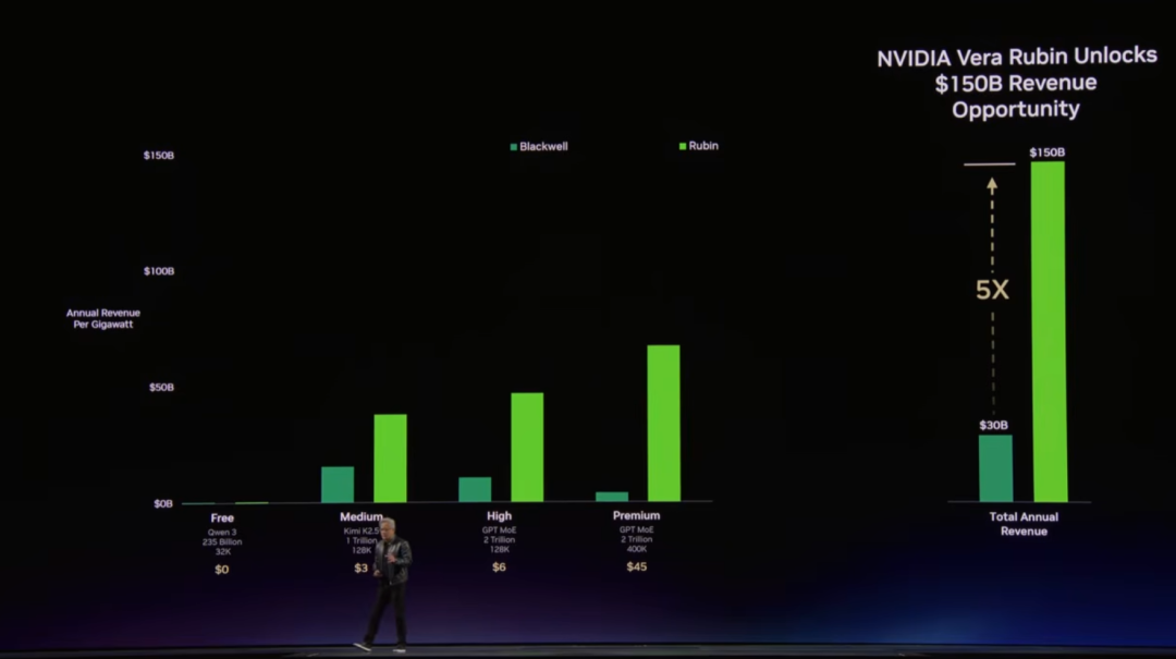 按 1 吉瓦数据中心简单测算:Grace Blackwell 相较 Hopper 吞吐量提升35 倍,收入增 5 倍;Vera Rubin 再提升 5 倍,收入再翻 5 倍。