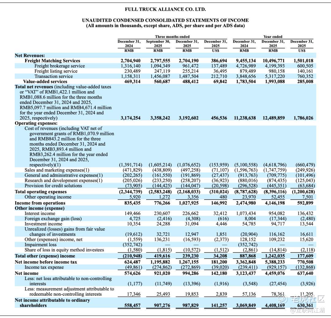 先说结论:虽然2025年满帮集团净利润同比增长42.8%,但满帮可能并没有真正意义上进入财务上的收获期。