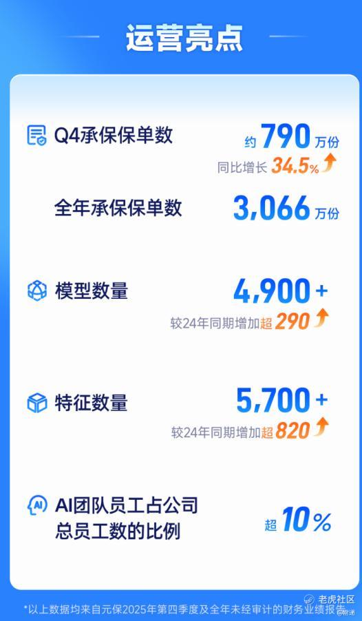 截至2025年12月31日,元保模型网络已扩充至超过4900个模型和5700个特征,较上年同期分别新增超290个模型和820个特征。在AI技术深度赋能下,公司运营效率与业务规模同步提升,全年新保单数量达3066万份,同比增长36.7%,第四季度新保单数量约790万份,同比增长34.5%。
