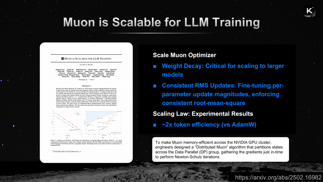 由此,Kimi引入了Muon优化器。Muon是一个二阶优化器,其核心思想是将每个梯度更新进行正交变换,使得更新方向上的各个条目彼此正交。在工程实现层面,Kimi团队开发了分布式Muon优化方案,在数据并行组之间分区优化器状态,使得Muon可以在NVIDIA GPU集群上高效运行,不因内存开销而拖慢训练进度。