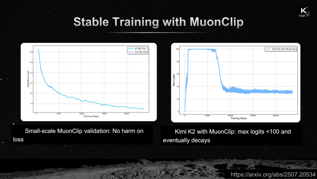 这个裁剪操作几乎不影响正常训练。杨植麟展示了一组对比实验:有QK-Clip和无QK-Clip的训练损失曲线几乎完全重叠,说明裁剪并未引入额外的信息损失。而在启用MuonClip(Muon + QK-Clip的组合)之后,K2模型的最大logits被稳定控制在100以下,并最终自然衰减。