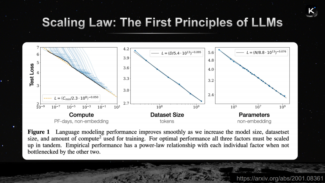 演讲一开始,杨植麟就放出了一张机器学习历史上“最经典的图”——来自DeepMind Chinchilla论文的Scaling Law曲线。横轴是训练所用的token数量,纵轴是模型损失,一条平滑下降的曲线揭示了“投入更多的数据、更大的模型、更多的计算,就能获得更低的损失、更好的智能”的道理。