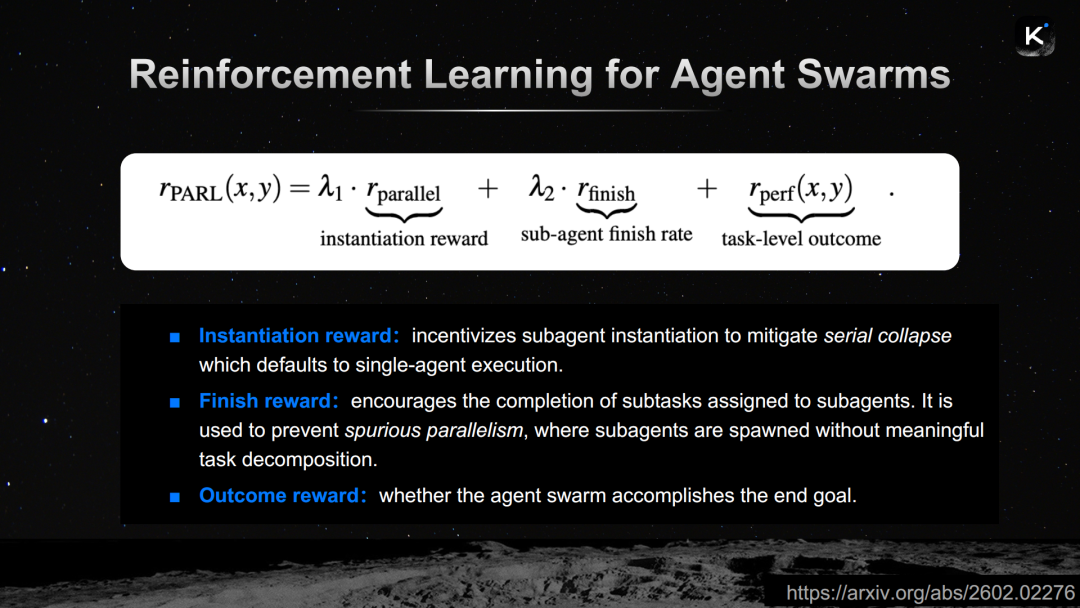 第二是完成奖励。这是为了解决另一个对称的问题——“虚假并行”。模型可能学会生成大量子智能体,但这些子智能体并不真正完成有意义的任务,只是做做样子。完成奖励确保每个被生成的子智能体都切实完成了分配给它的子任务。