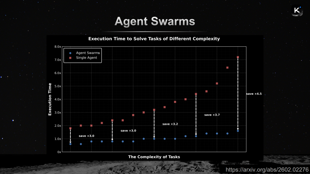 杨植麟展示了一张图表:横轴是任务复杂性(由模型组在该任务上的准确率衡量),纵轴是执行时间。图中清晰地显示,智能体群相比单智能体在执行时间上有大幅缩减,在复杂任务上可以节省4.5倍的时间。杨植麟表示:“如果我们扩展到100甚至1000个智能体,就可以在可容忍的时间内完成极其复杂的任务,产生真正的经济价值。”
