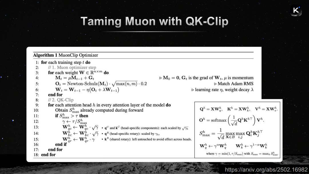 Kimi团队给出的解决方案是QK-Clipping(QK裁剪)技术。其原理并不复杂:对于每个注意力头,在前向传播中实时监控最大logit值,然后计算一个除法因子,应用于键(Key)和查询(Query)投影,将最大值限制在特定范围内,防止数值爆炸。