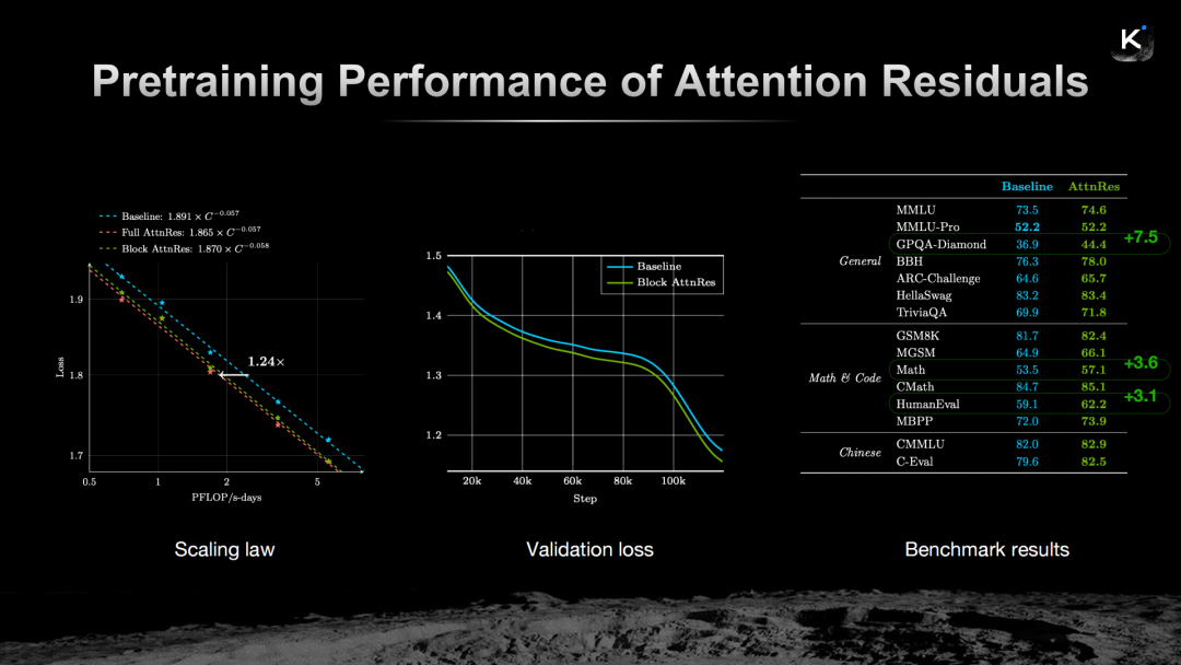 在Scaling Law实验中,Block Attention Residuals架构实现了1.24倍的计算效率提升;在验证损失曲线上,Block Attention Residuals的表现持续优于基线;在MMLU-Pro、GPQA-Diamond、BBH等多项基准测试中,Block Attention Residuals也均有显著提升。