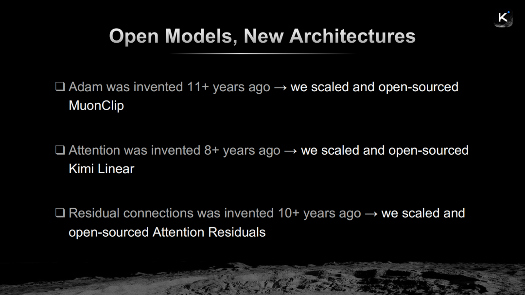 “Adam优化器发明于11年前,我们扩展并开源了MuonClip。Transformer架构发明于8年前,我们扩展并开源了Kimi Linear。残差连接发明于10年前,我们扩展并开源了Attention Residuals。”