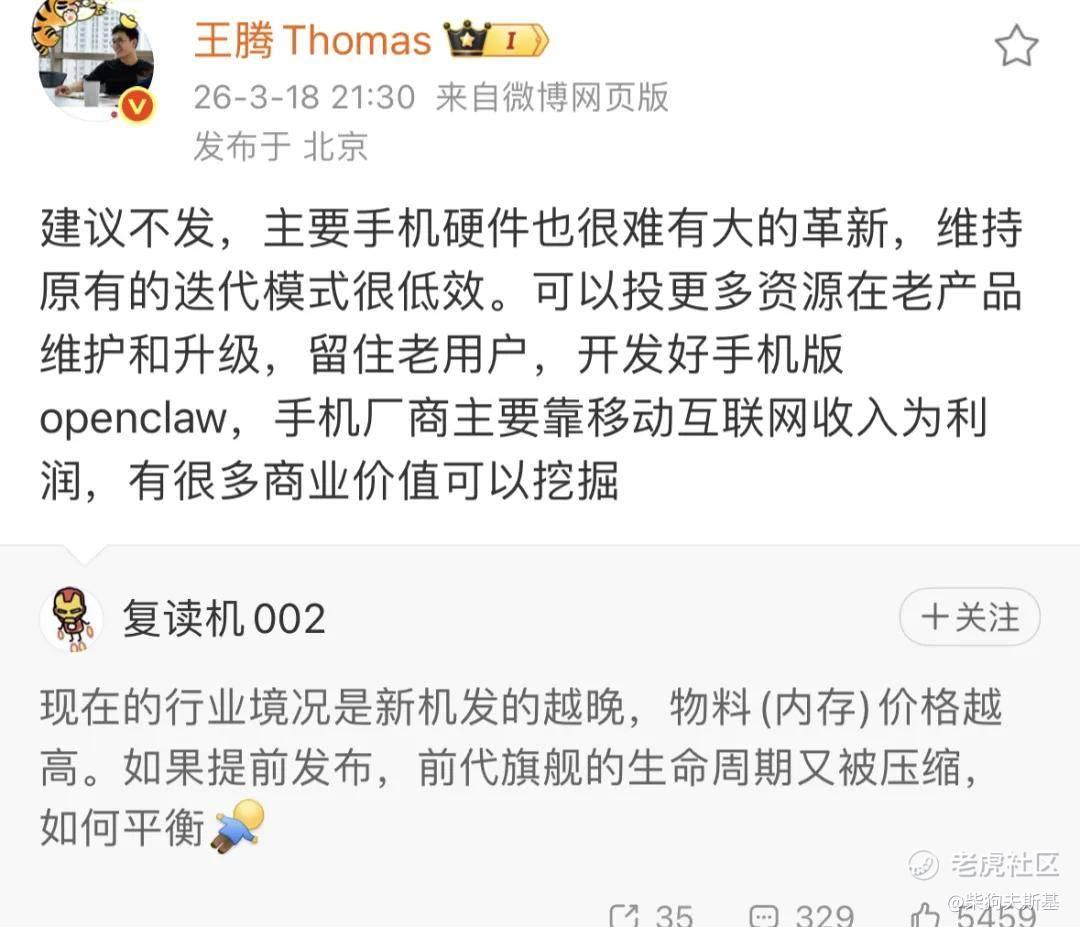 王腾为手机行业破局献策:不要发新机了,维护老产品开发手机龙虾……