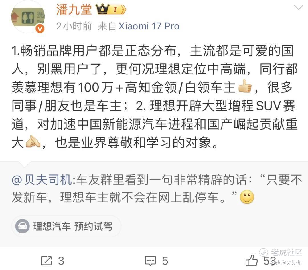 对此,小米高管潘九堂发文为理想说公道话:畅销品牌用户都是正态分布,主流都是可爱的国人,别黑用户了,更何况理想定位中高端,同行都羡慕理想有100万+高知金领/白领车主,很多同事/朋友也是车主