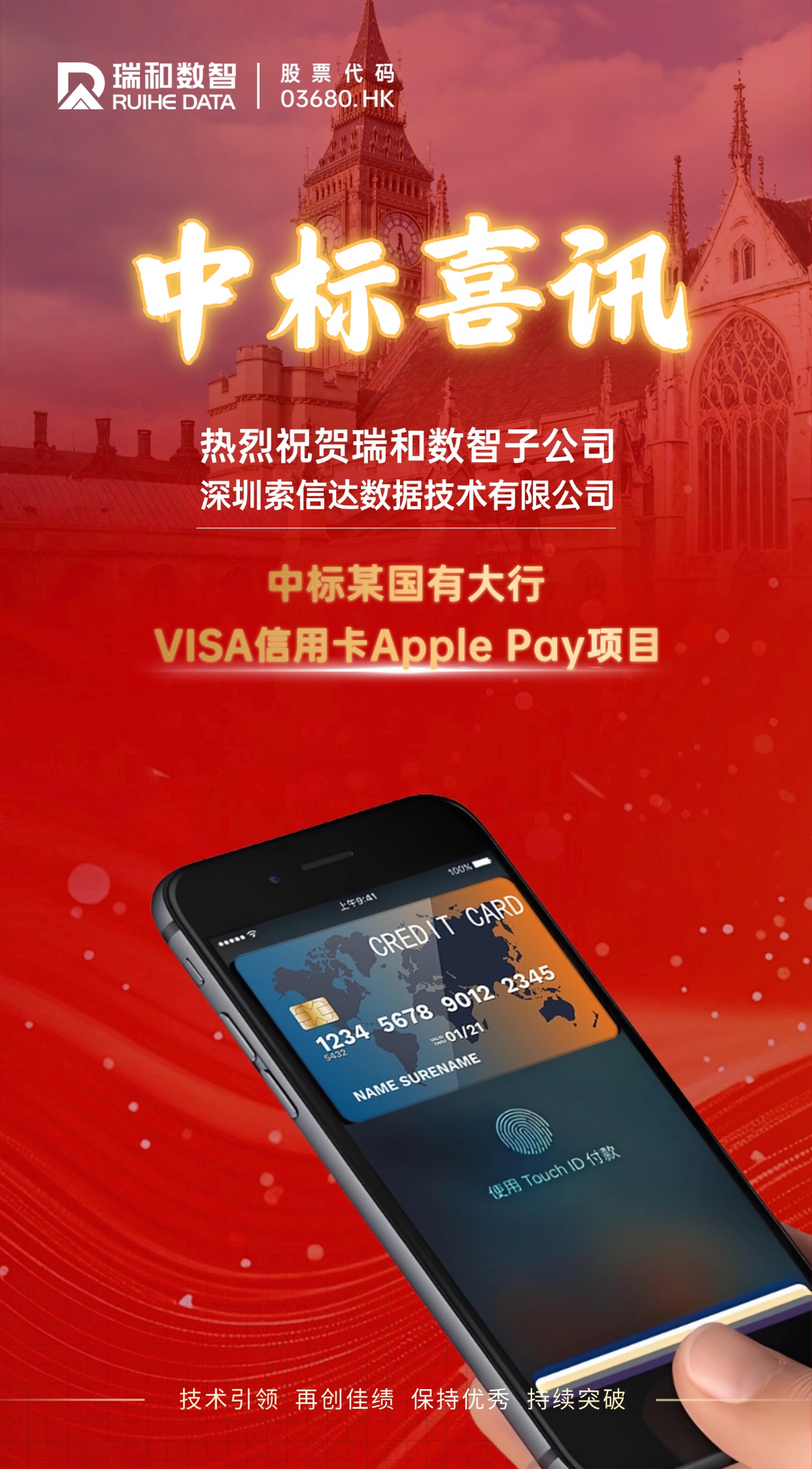 近日,瑞和数智(03680.HK)旗下子公司深圳索信达数据技术有限公司成功中标“某国有大行VISA信用卡支持Apple Pay功能项目”,为该行持卡人打造更便捷、安全的移动支付体验。此次合作标志着瑞和数智在金融数字化解决方案领域的实力再获国家级银行认可。