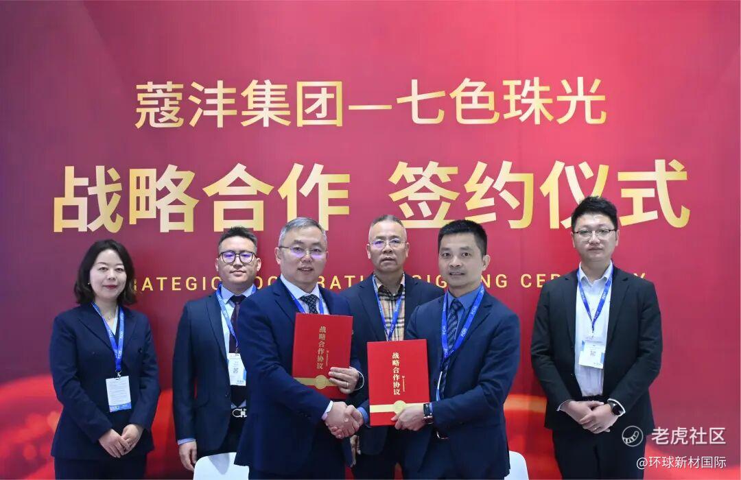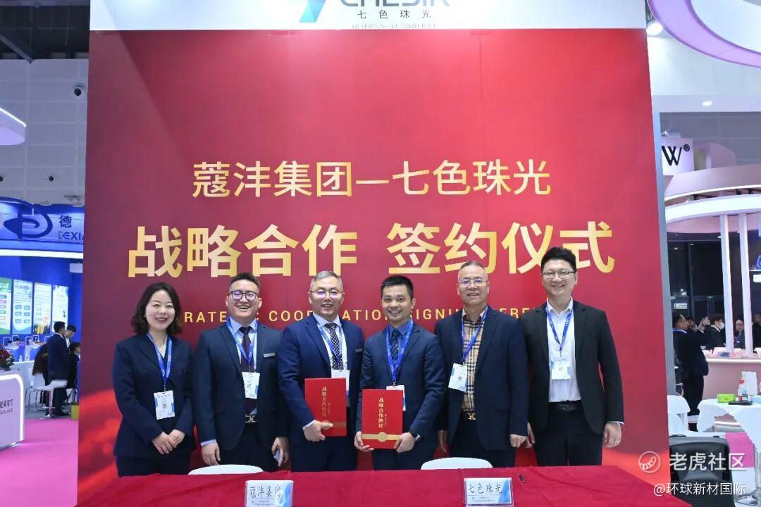 3月18日,2026中国国际化妆品、个人及家庭护理用品原料展览会(PCHi 2026)启幕当日,环球新材国际旗下广西七色珠光材料股份有限公司在【6F10】展位与蔻沣集团正式签署战略合作协议,双方将成立联合实验室,围绕化妆品领域珠光材料、合成云母创新开发与应用探索开展深度协作。七色珠光总经理周方超、蔻沣集团创始人兼总经理蒲科分别代表双方签约。浙江鸿尊科技总经理金增勤、七色珠光销售总监陈敏出席活动并见证签约。