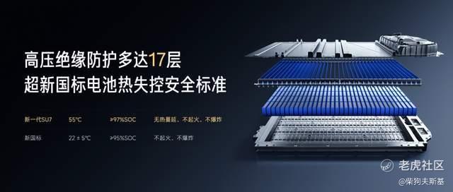 在热安全方面,新一代SU7电池包可以做到远超新国标的电池热失控安全标准:在55℃满电状态下,单电芯发生热失控时,系统可实现热失控不扩散、不起火、不爆炸。同时,全系标配行业最高ASIL-D安全等级电池系统,BMS电池管理系统可在突发情况下4ms内完成紧急断电,并通过24小时车云协同机制实现全天候安全预警。