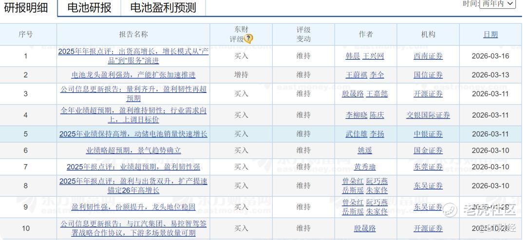进入2026年有9家机构对宁德时代进行评级,这9家机构均对宁德时代进行了“买入”和“增持”的评级。在财报发布后有西南证券和国信证券对宁德时代进行“买入”和“增持”的评级。