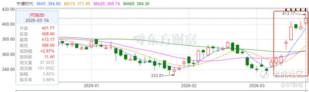 西南证券认为“宁德时代出货高增长,增长模式从‘产品’到‘服务’演进”,研报指出“宁德时代通过车电分离与换电模式来提升客户终端体验,与中石化合作,在乘用车便捷补能和商用车干线物流两大应用场景建设补能网络。与多家下游车企联合推出换电车型,截至2025年底,累计建成1325座换电站,其中巧克力换电突破1000座,骐骥换电突破300座,逐步从产品输出模式演化为产品+服务一体化模式,未来增长动力十足。”研报预计2026-2028年宁德时代EPS分别为19.92元、24.10元、28.98元,对应PE分别为20倍、16倍、14倍。研报认为宁德时代海外产能稳健释放,新型产品持续落地,产能建设进度放缓,提高分红比例领先行业进入兑现期,维持“买入”评级。