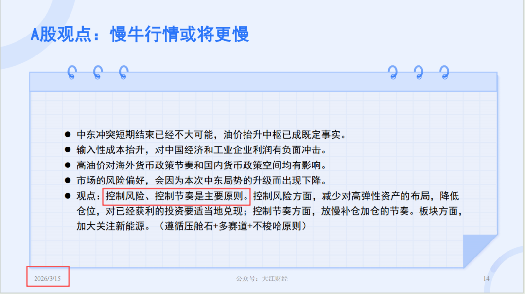 3月15日《拐点周报》A股观点:慢牛行情或将更慢,控制风险、控制节奏是主要原则。