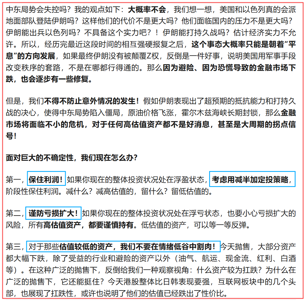 这次中东局势不确定性非常大,预计继续造成金融市场剧烈波动。如果你是“大周期投资者”,为了防御不确定性带来的风险,接下来的操作原则是“保住利润和降低仓位”。如果你是长期资产配置型投资者,可“以不变应万变”,甚至在危机严重时期“增加优质资产”布局。