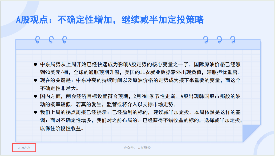 3月8日《拐点周报》A股观点:不确定性增加,继续减半加定投策略,保住阶段性收益。