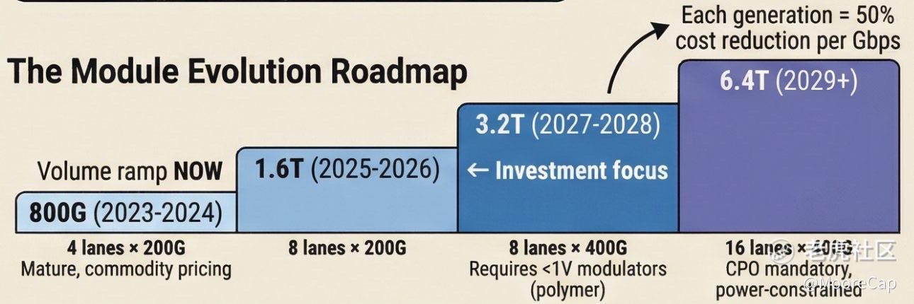 1.6T 爬坡 → 3.2T 投资周期 → 6.4T 共封装光学器件(CPO)时代。