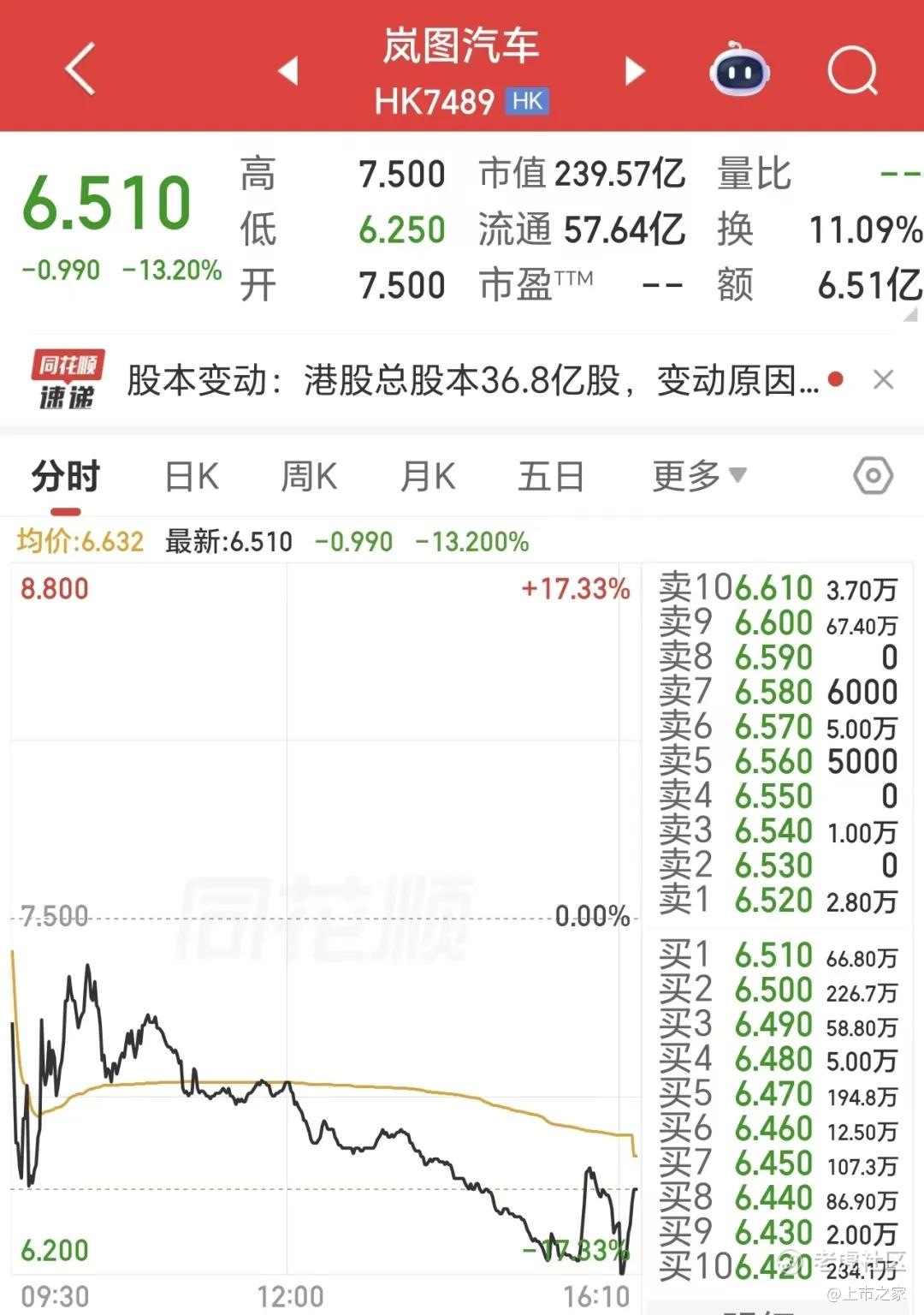 今日早盘,岚图汽车开盘价为7.5港元/股,开盘即破发。此后股价一路下行,尾盘跳水一度跌幅超17%。收盘报6.51港元/股,对应市值239.57亿港元,流通值仅为57.64亿港元。