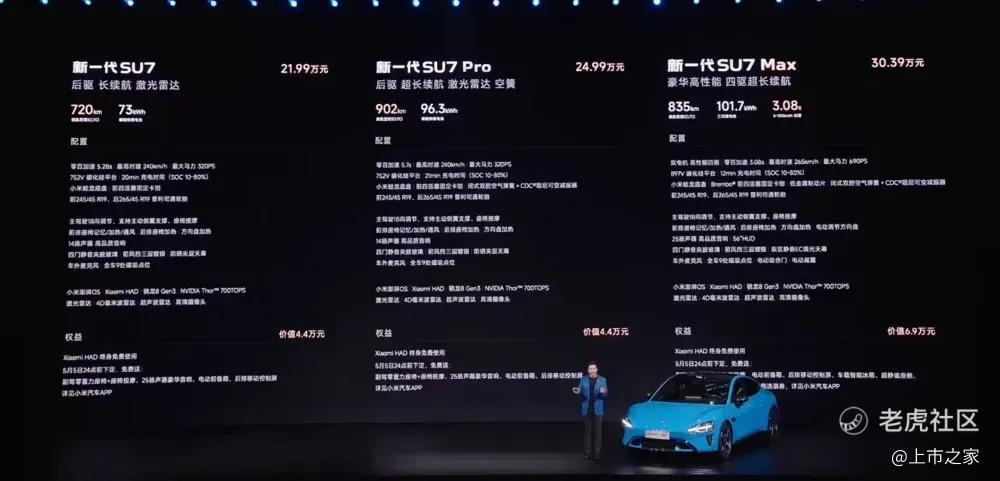 价格方面,雷军表示,新一代SU7标准版定价21.99万1辆。pro版定价24.99万元1辆,max版定价30.39万元1辆,与第一代SU7相比,均涨价4000元。