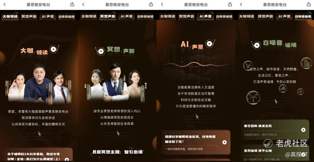 为了解决这一痛点,慕思与喜马拉雅合作,定制“慕思晚安电台”:每月批量更新、确保供应持续性;内容涵盖AI哄睡、白噪音、冥想等不同形式,并联合樊登读书制作“大咖讲书”栏目,适配不同人群的需求。