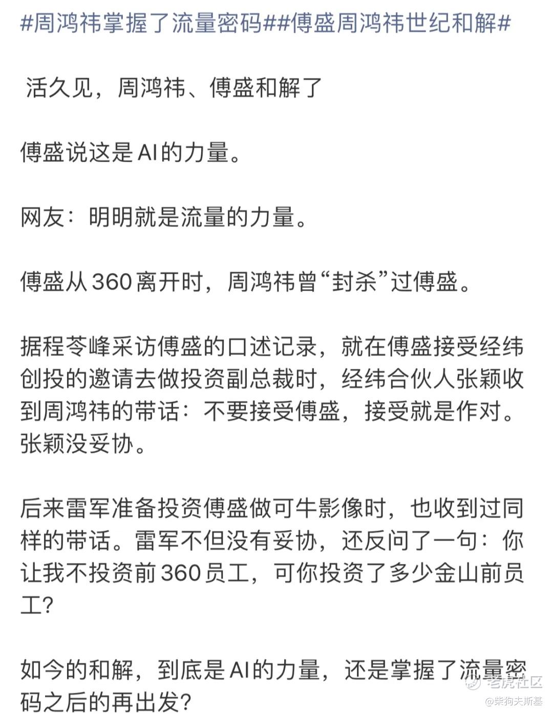周鸿祎表示自身脾气变好,过往已是「陈芝麻烂谷子」,并对傅盛在 AI 领域的进展表示认可;傅盛也展现出放下过去的姿态,双方当时被视为冰释前嫌,共同探讨大模型与 AI 未来。