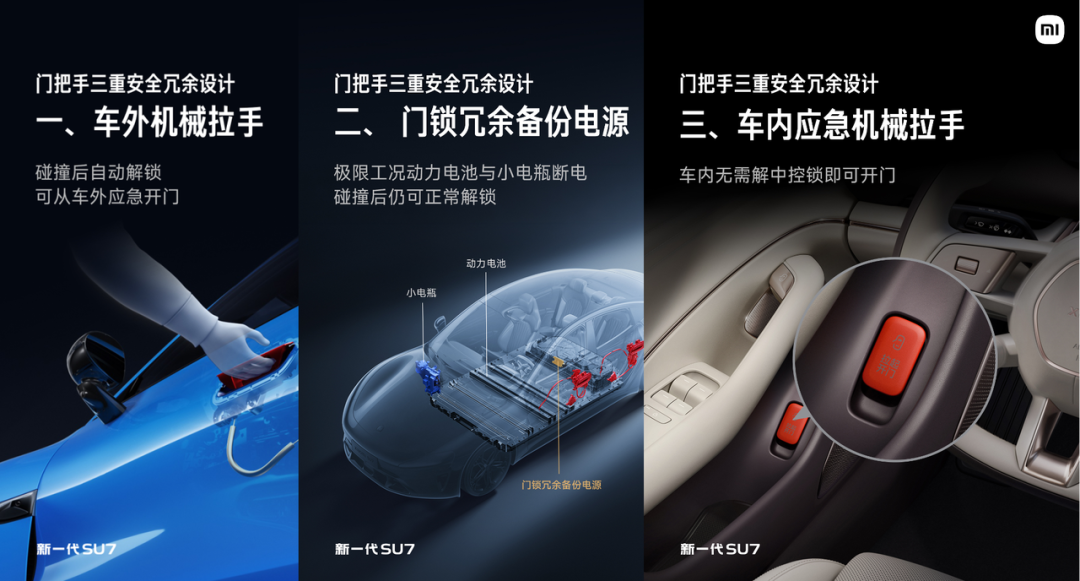 比如门把手安全设计,100%符合2027年新国标,共有三重安全冗余设计:
