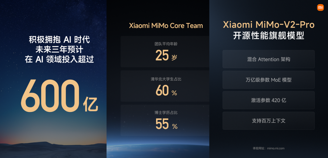 发布小米首款自研旗舰大模型Xiaomi MiMo-V2-Pro,MiMo模型背后团队平均年龄仅25岁,未来三AI领域计划投入资金超过600亿元。