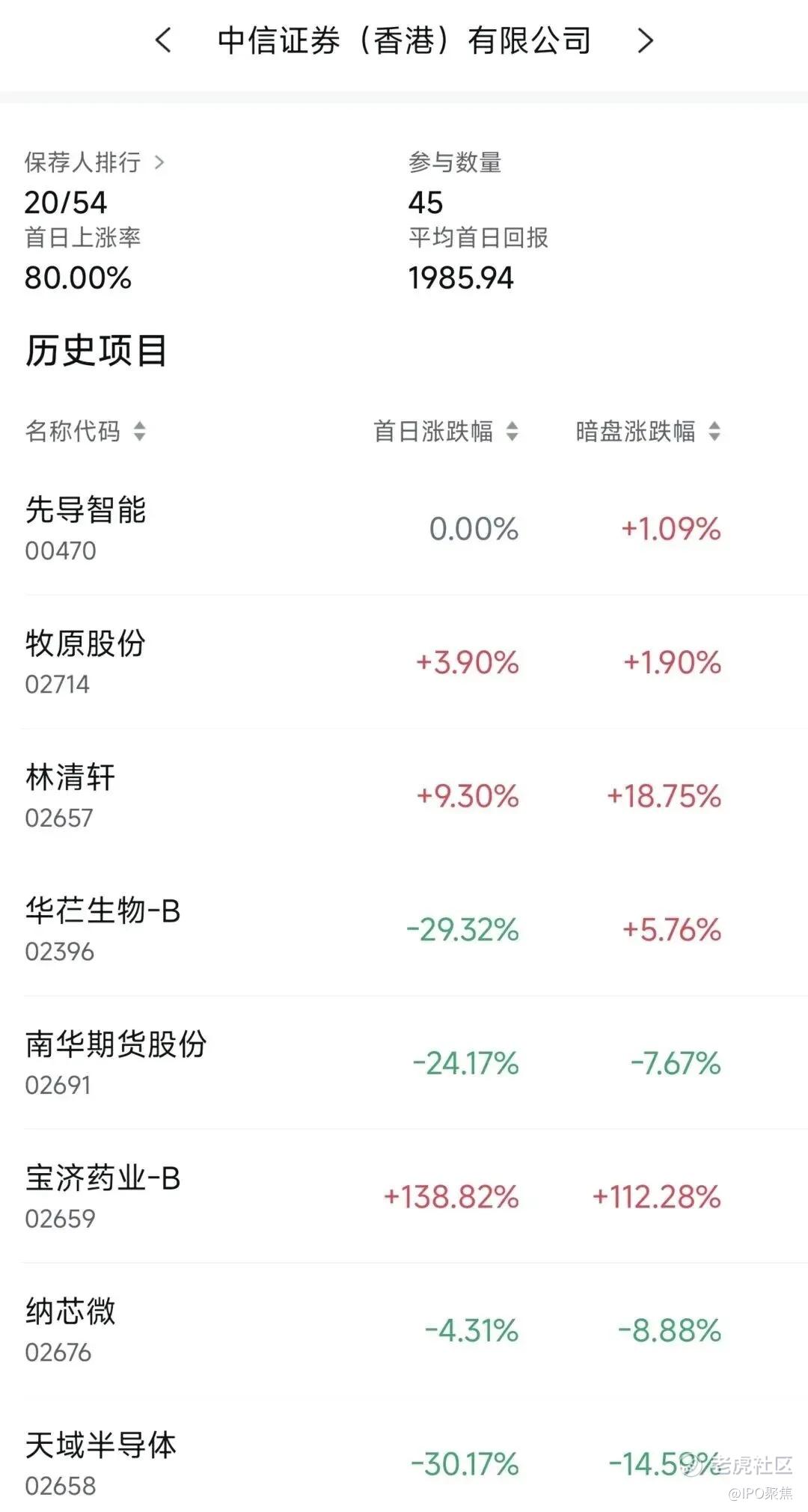在中信证券近2年保荐的港股项目中,首日上涨率为80.00%,平均首日回报1985.94港元。