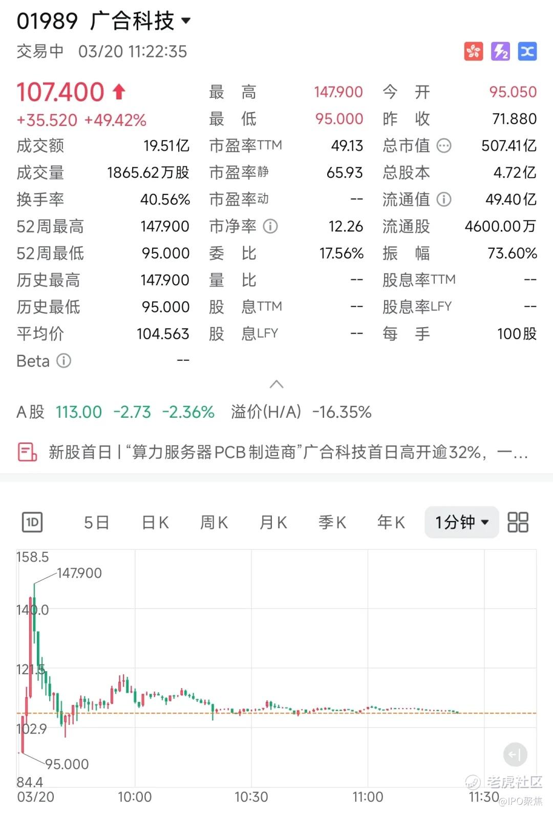 今日开盘最高涨幅达到105.76%,报147.90港元。截至发文前,涨49.42%,报107.40港元,总市值507.41亿港元。