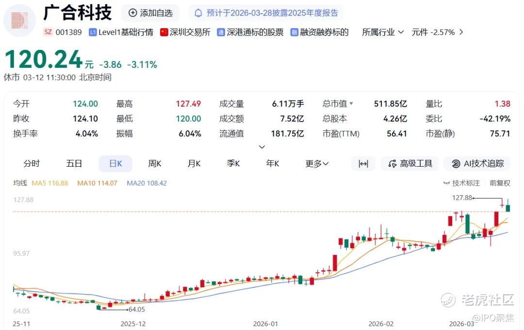 广合科技成立于2022年6月,由肖红星、刘锦婵夫妇实际控制。公司于2024年4月在深交所主板挂牌。截至发文前,广合科技(001389.SZ)跌3.11%,报120.24元,总市值511.85亿元。