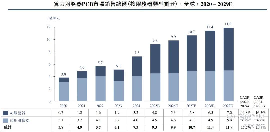 据弗若斯特沙利文数据,全球算力服务器PCB的市场销售总额持续提升,从2020年的38亿美元增至2024年的73亿美元,复合年增长率为17.7%,后续预计将以10.4%的速度增至2029年的119亿美元。