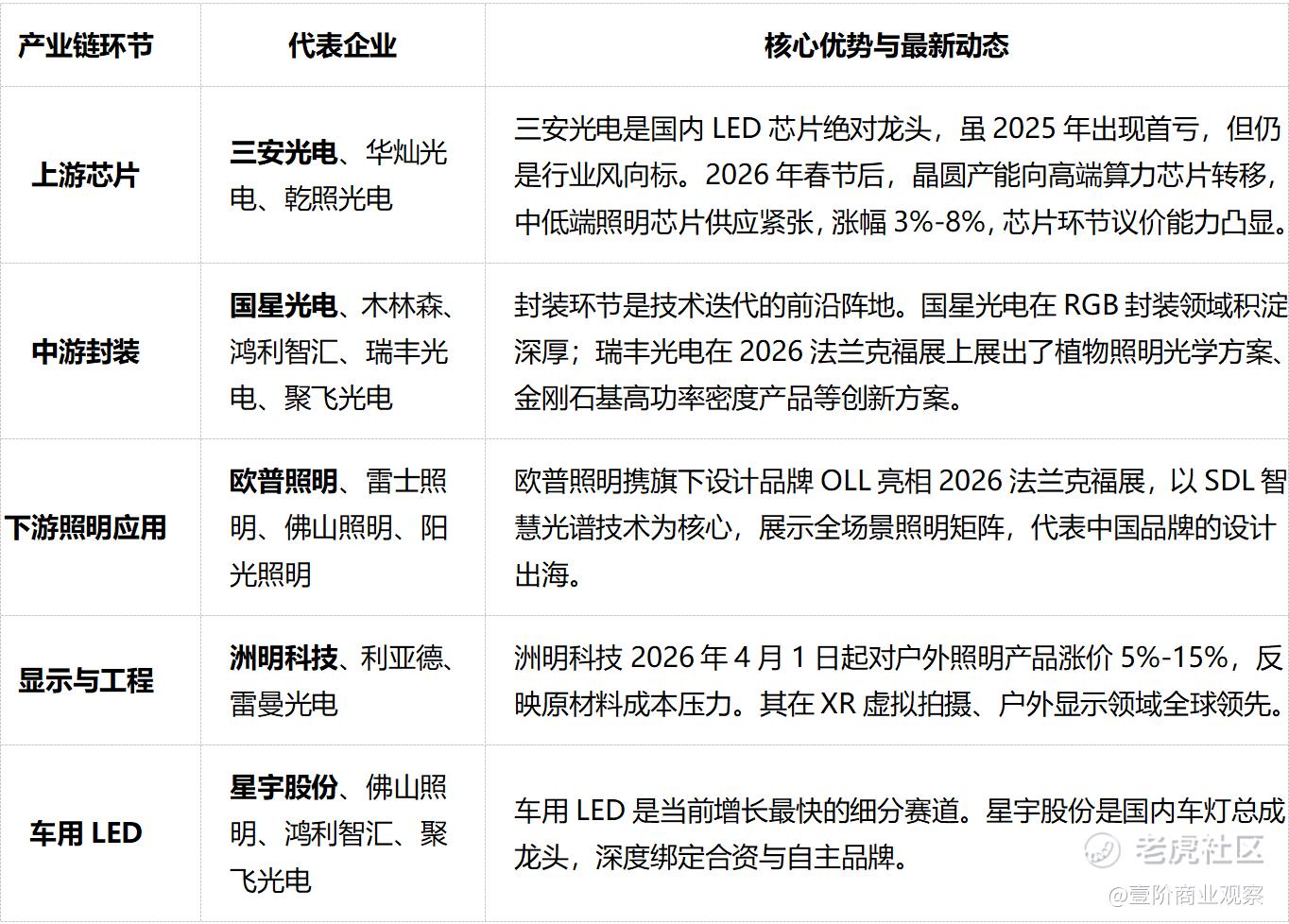 今天的LED产业,早已不是做灯泡那么简单。从上游的芯片、中游的封装、下游的应用,到新兴的显示、车载、植物照明等细分赛道,每个环节都有自己的领跑者。而理解这些龙头的卡位,恰恰是判断价值的关键参照系。