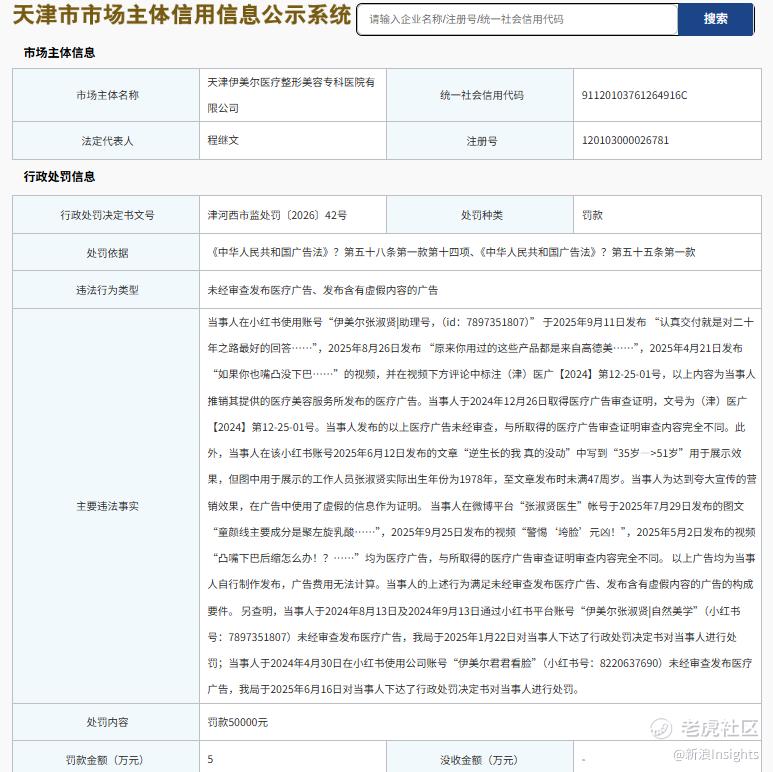 2026年初,天津市河西区市场监督管理局的一纸罚单撕开伊美尔营销乱象:天津伊美尔医疗整形美容专科医院为夸大抗衰效果,将47岁员工虚报为51岁,编造“逆生长”神话,被认定为虚假广告并罚款5万元。