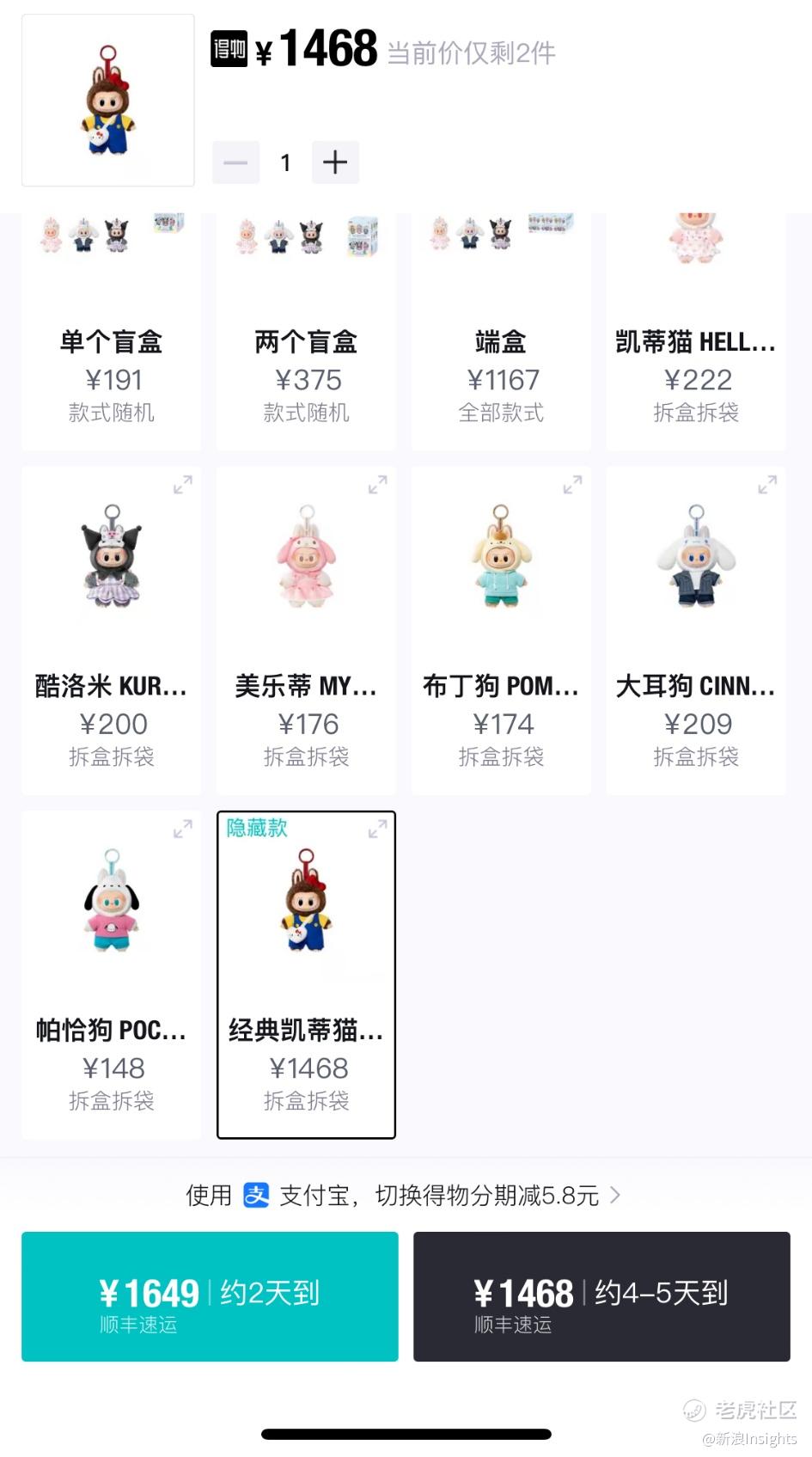 消费者的热捧之下,"美梦奇遇记"系列盲盒价格疯狂上涨。得物APP显示,该系列多个款式中,普通款凯蒂猫、库洛米已分别涨至222元和200元,而隐藏款"经典凯蒂猫"溢价一度达到1468元,较发售价翻了超过9倍。