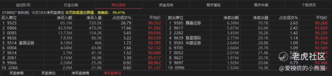 广合科技(01989.HK)买盘席位有9523、0866、0085、9656等,卖盘第一席位是9585。