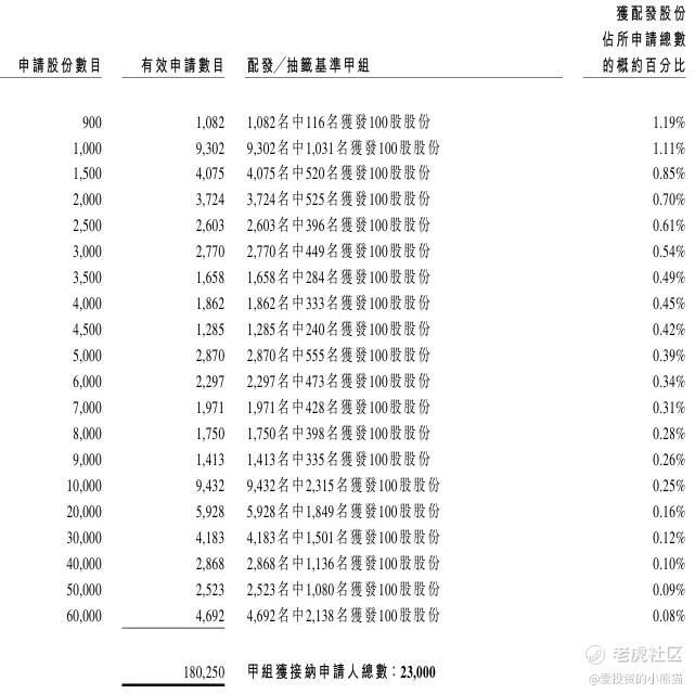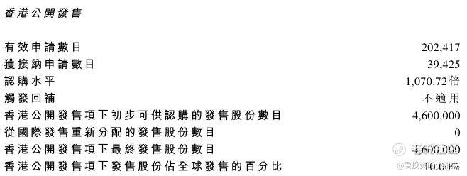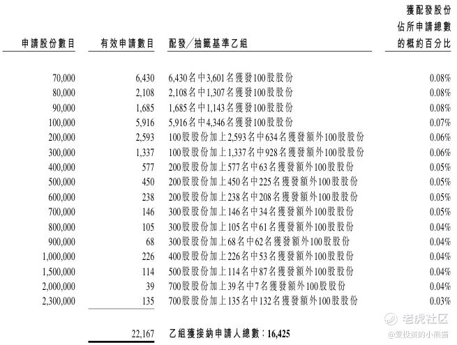 配售情况:202417人认购,这次公配1070.72倍,由于机制B分配,无回拨比率,国配有14.64倍,一手中签率5.00%,认购2000手稳中1手,同时乙组22167人申购,其中顶头槌申购135张,获配率0.03%-0.08%。