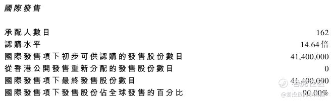 广合科技(01989.HK)国际配售总共162人,认购额14.64倍。